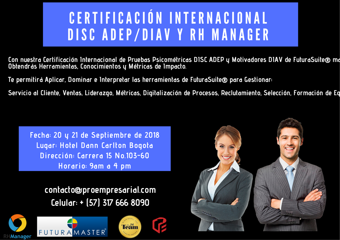 1. -CERTIFICACIÓN PRUEBAS PSICOMETRICAS DISC Y MOTIVADORES DIAV:- Taller de Certificación Internacional de Pruebas Psicométricas DISC ADEP y Motivadores DIAV de FuturaSuite. Futurasuite® es marca registrada. Miembro Activo y Acreditado por la Asociación de Test Publishers Global (ATP). No está condicionado al uso o compra del software. Usted obtiene los materiales y el conocimiento para utilizar