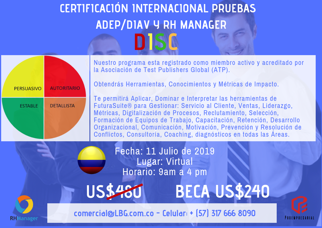 1. -CERTIFICACIÓN PRUEBAS PSICOMETRICAS DISC Y MOTIVADORES DIAV:- Taller de Certificación Internacional de Pruebas Psicométricas DISC ADEP y Motivadores DIAV de FuturaSuite. Futurasuite® es marca registrada. Miembro Activo y Acreditado por la Asociación de Test Publishers Global (ATP). No está condicionado al uso o compra del software. Usted obtiene los materiales y el conocimiento para utilizar DISC sin necesidad de software.