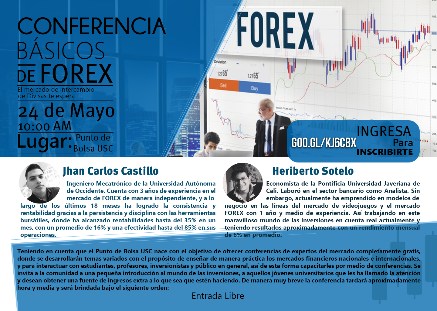 Se invita a la comunidad estudiantil de la Universidad Santiago de Cali a una introducción al mundo de las inversiones en el mercado financiero FOREX a través de la educación y de la información. Se ofrece una conferencia con expertos en el tema para enseñar de manera practica la pedagogía en estos mercados bursátiles con plataformas interactivas que facilitan el análisis y las operaciones de inversión.