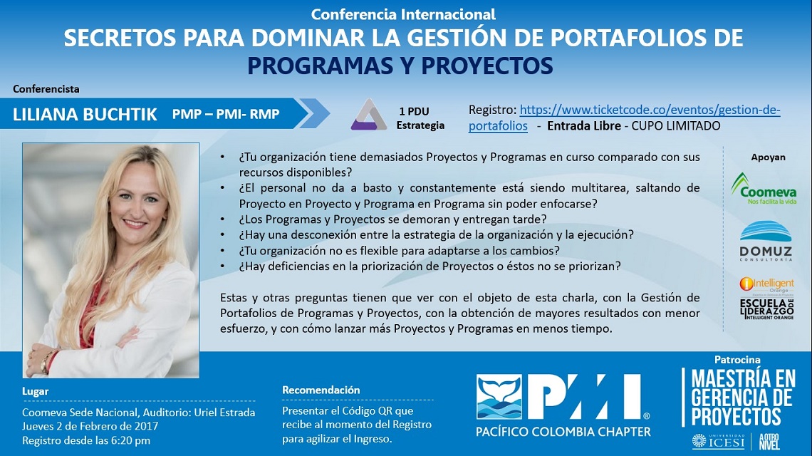 El PMI Pacifico Colombia - Potential Chapter, inicia este nuevo año con un importante Evento de Talla Internacional, presentando en Cali a LILIANA BUCHTIK - PMP, PMI-RMP, este 02 de Febrero desde las 7:00 p.m.