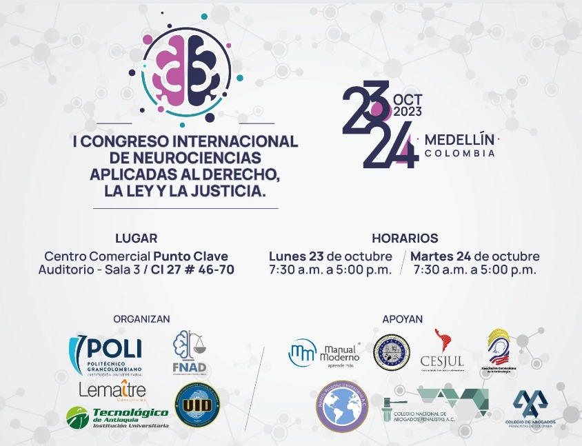 La Fundación para el avance de las Neurociencias aplicadas al Derecho, la Ley y la Justicia (FNAD) y el Politécnico Gran Colombiano, con el apoyo de prestigiosas organizaciones públicas, privadas y académicas de Iberoamérica, se complacen en convocar a científicos, tecnólogos, profesores, estudiantes, operadores de justicia, abogados, empresario, e interesados en conocer, difundir o actualizarse en los avances de las neurociencias aplicadas al derecho, la ley y la justicia.