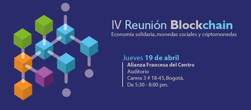 El jueves 19 de abril de 5:30 a 8:00 pm se realizará la IV Reunión Blockchain en el auditorio de la Alianza Francesa del Centro. Esta cuarta reunión está dedicada al tema “Economía solidaria, monedas sociales y criptomonedas” con el objetivo de acercar al sector solidario a proyectos locales descentralizados basados en la cadena de bloques.