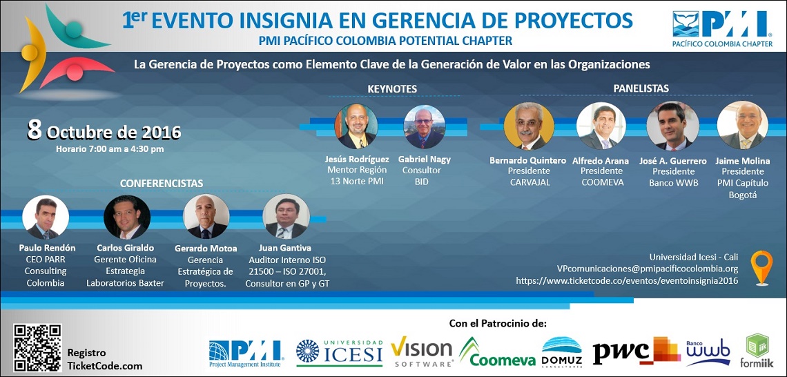 EL PMI PACIFICO COLOMBIA POTENTIAL CHAPTER, se complace en invitarlos al PRIMER EVENTO INSIGNIA EN GERENCIA DE PROYECTOS, caracterizándose como el más grande e importante Evento en Gerencia de Proyectos del Sur Occidente del País.
