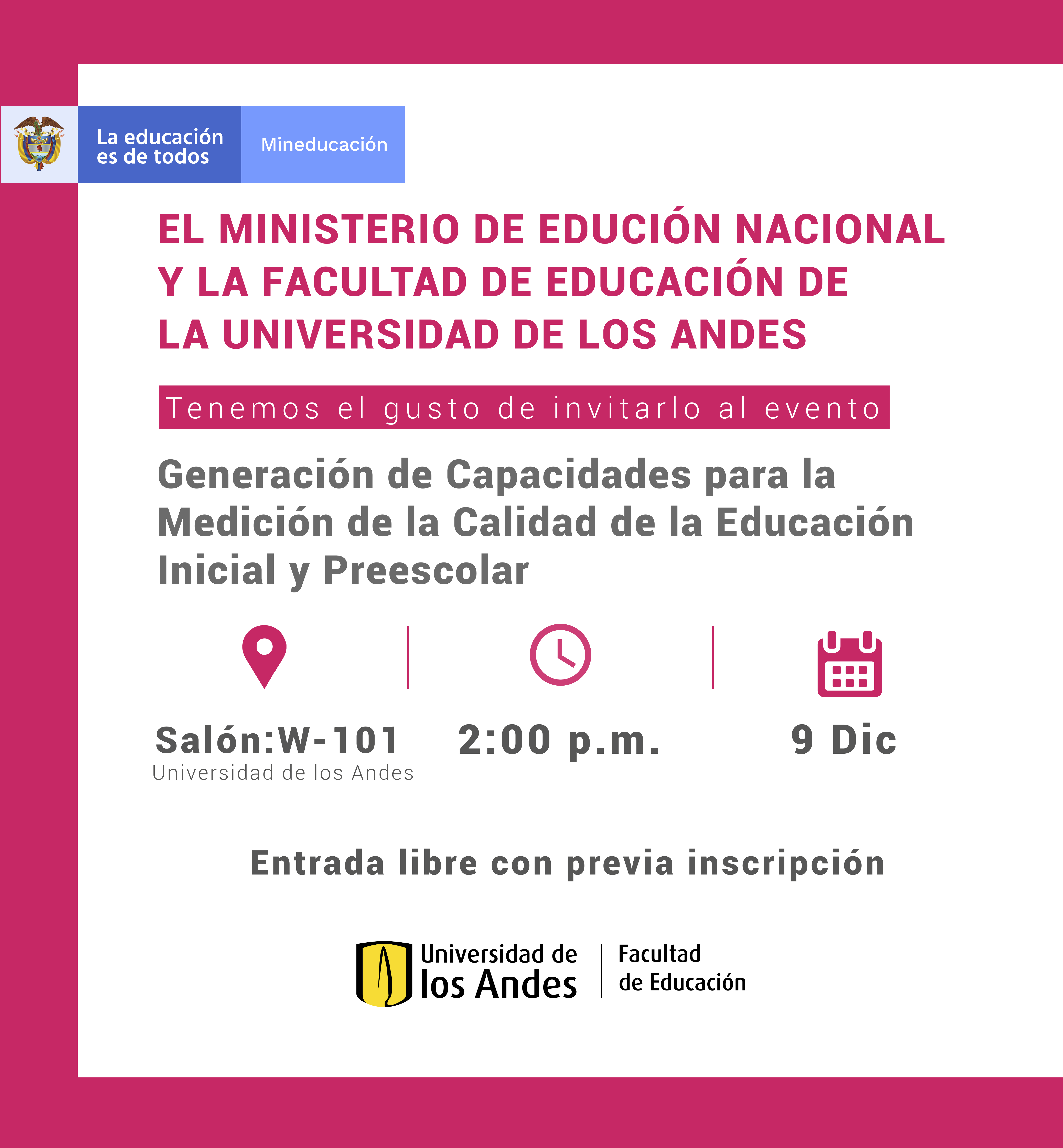 El Ministerio de Educación Nacional y la Facultad de Educación de la Universidad de los Andes lo invitan al evento "Generación de Capacidades para la Medición de la Calidad de la Educación Inicial y Preescolar", en el que se presentará el Modelo de Medición de la Educación Inicial y Preescolar en Colombia, junto con las experiencias de su aplicación.