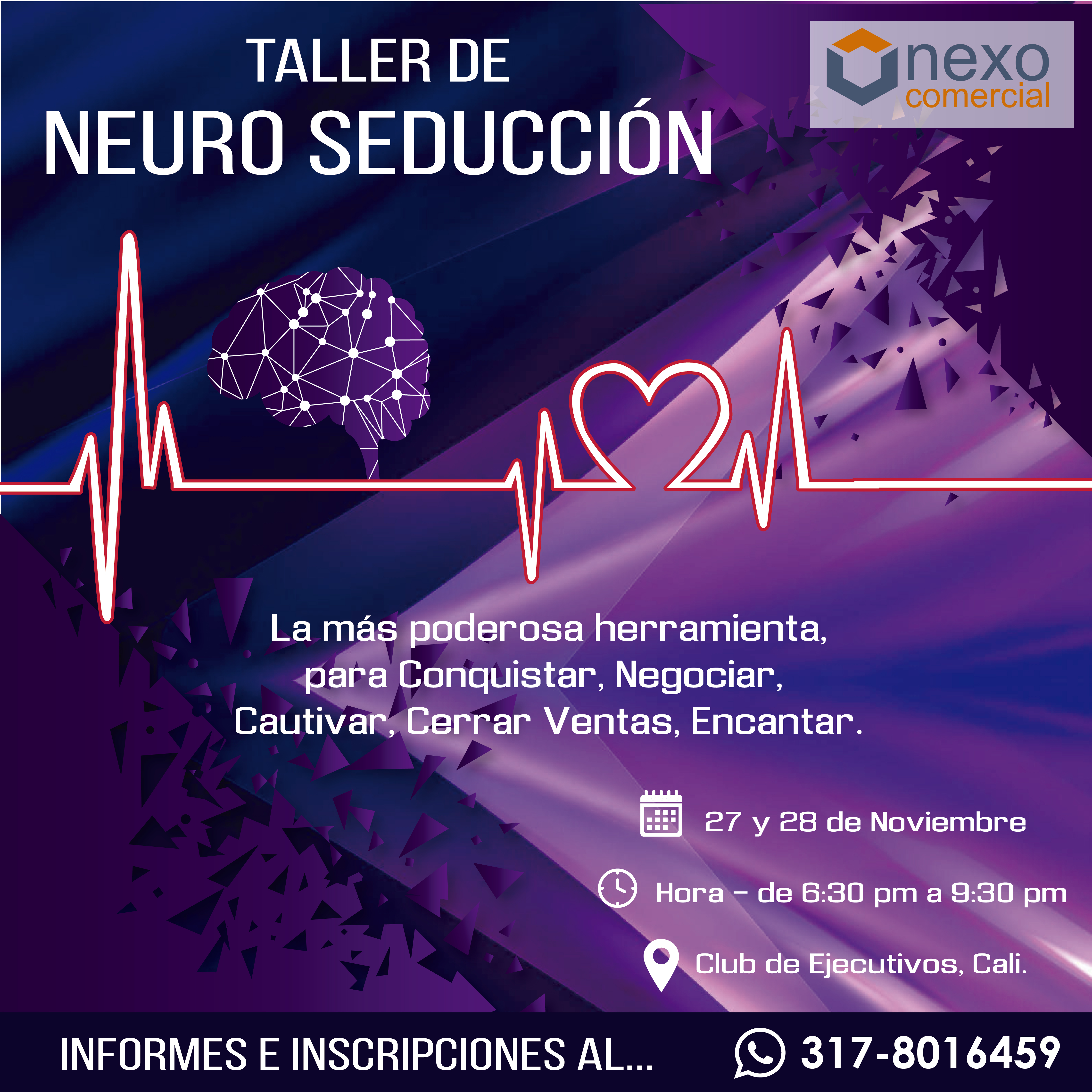 El evento NEURO-SEDUCCION se llevara a cabo los días Martes 27 y Miércoles 28 de Noviembre, de 6:30pm a 9:30pm, en Cali, en el Club de Ejecutivos.