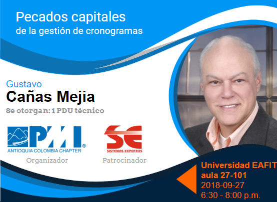 Gustavo Cañas Mejía. Consultor Sr. en Gestión de Proyectos, Programas y Portafolios. Project Management Professional del PMI desde 2010. Conferencista en congresos y seminarios de gestión de proyectos: Congresos internacionales I y II de gerencia de proyectos del PMI Capítulo Bogotá, Comunidad de Gerencia de Proyectos del PMI Capítulo Antioquia, Congreso Iberoamericano de Ingeniería de Proyectos. Docente en Gestión de Proyectos para certificación PMP, Docente en Gerencia de Proyectos de la Facultad de Ciencias Económicas de la Universidad Eafit, Universidad Pontificia Bolivariana, Cámaras de Comercio de Bogotá y Medellín. Con 35 años de experiencia en Proyectos de Ingeniería: Grupo Nutresa, Compañía de Galletas Noel S.A., HATCH INDISA S.A., Zenú, Prebel S.A., Cervecería Unión S.A. Ingeniero Mecánico de la UPB, especialista en Gerencia de UPB, Especialista en Administración Gerencial de Eafit. Certificado PMP, Certificado en análisis de datos con Excel por Microsoft Corp.